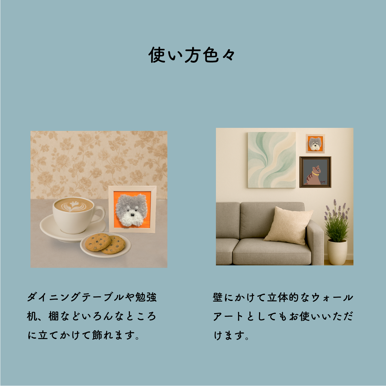 ⚫︎ウォールアート・アートスタンド【シュナウザー】:ちょっと丸いシュナウザーのウォールアート兼アートスタンド。ぽふぽふで立体的なので、壁にかけると目を惹きます。また、立てかけ用の脚がついているので机や棚などお好きなところに飾ることができます。